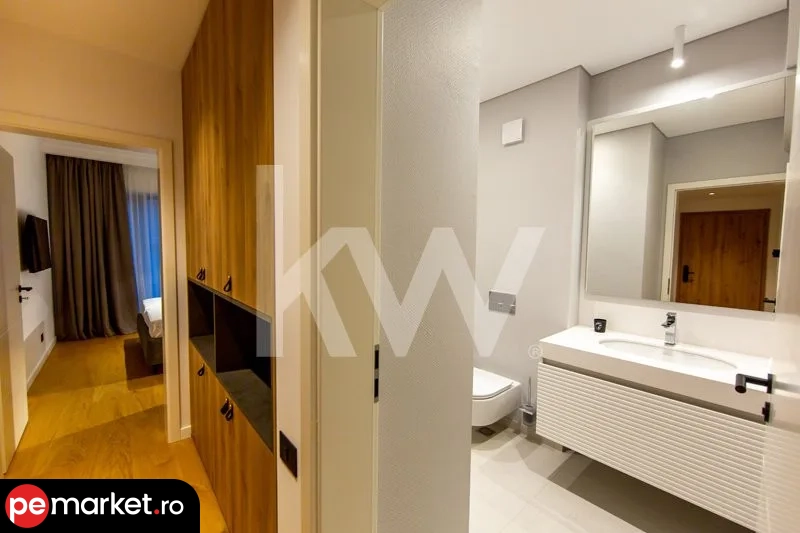 Designul interior este modern și elegant, cu lumină ambientală reglabilă, bandă LED în zona de bucătărie și finisaje din piatră naturală și marmură în băi, oferind un ambient rafinat și plăcut.